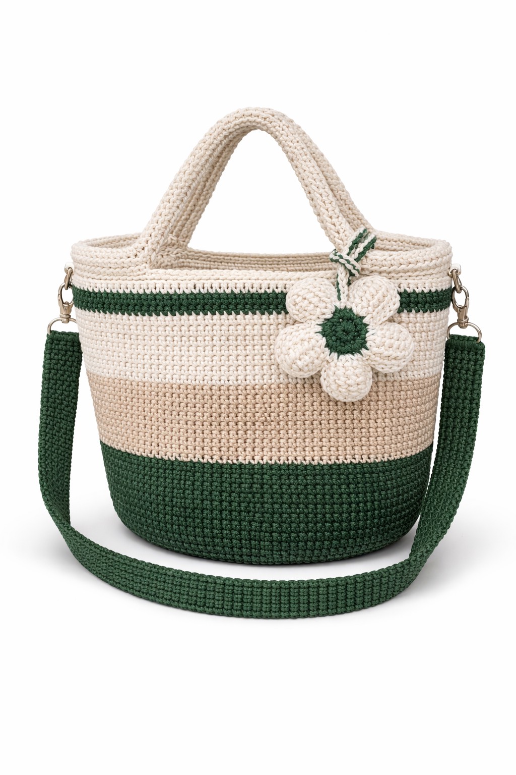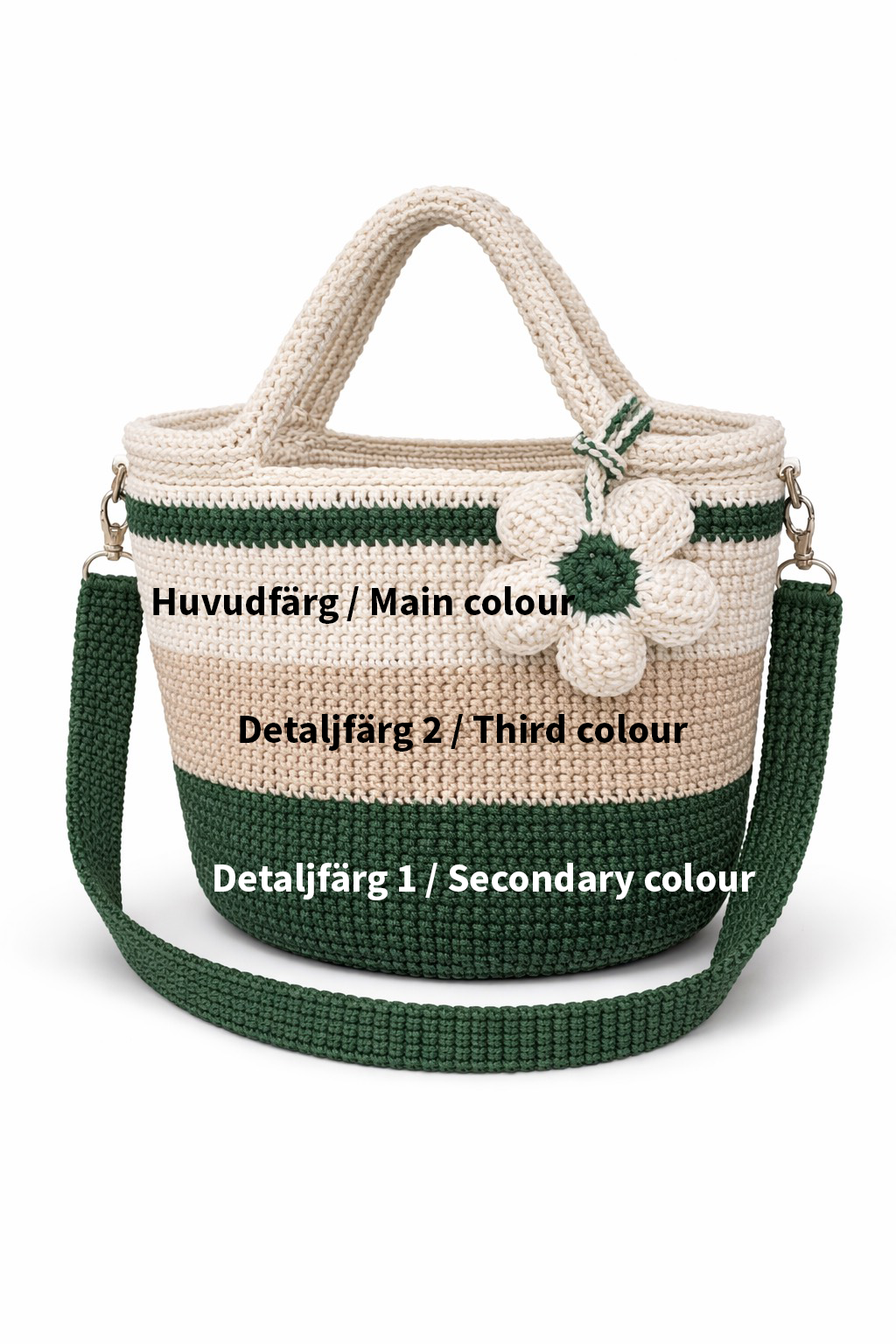 Denna virkade väska är kärleksfullt handgjord, maska för maska, med omsorg och uppmärksamhet på varje detalj. Dess enkla men charmiga hinkform ger en varm, naturlig handgjord känsla som passar perfekt till vardagsstilen.