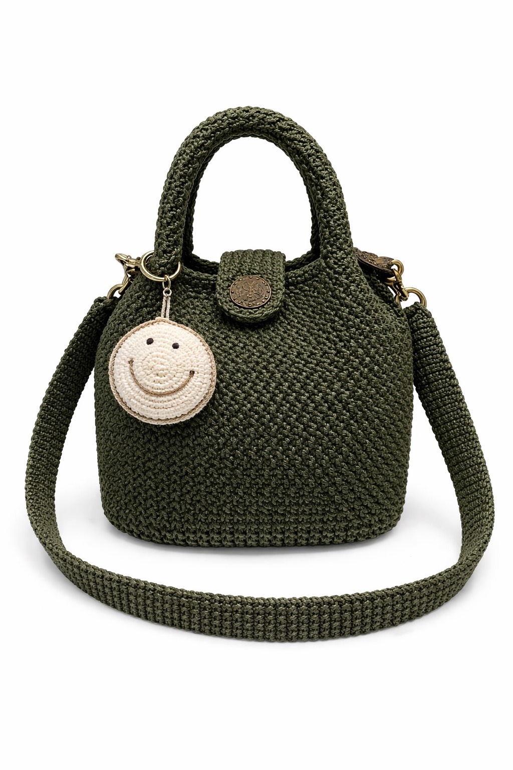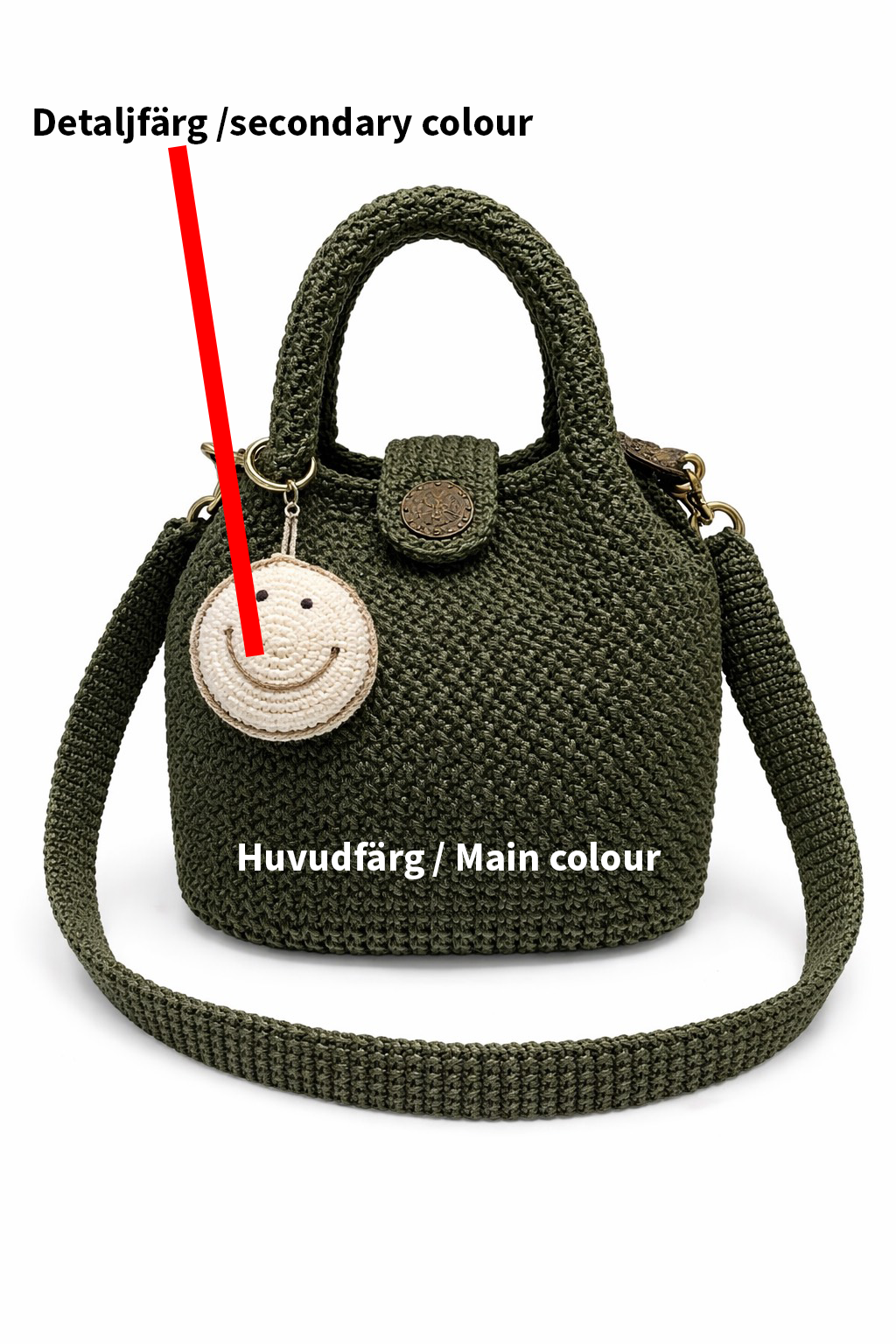Denna väska är designad i en klassisk hinkform och är både snygg och praktisk. Den har ett bekvämt handtag och en avtagbar axelrem, så att du kan bära den i handen eller crossbody. Den lilla handgjorda smiley-berlocken ger en varm och lekfull touch.