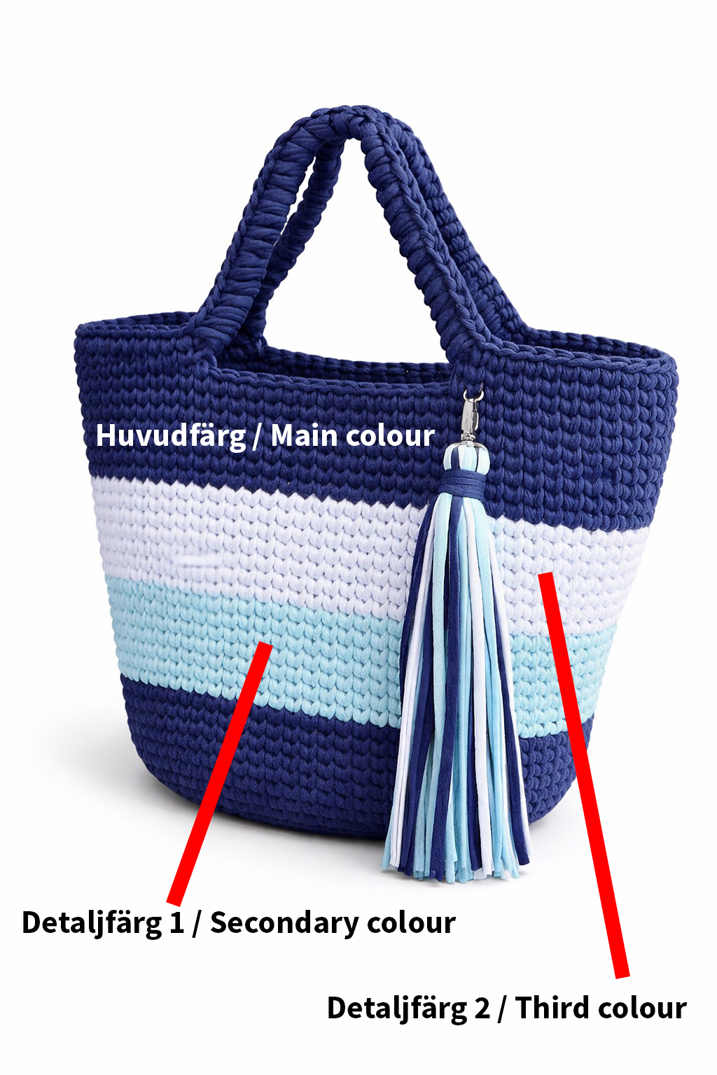 Denna vackra handgjorda virkade väska har en ren och elegant design i marinblå, vita och ljusblå toner. Noggrant tillverkad med noggrannhet i detaljerna är den robust, lätt och bekväm att bära. Den dekorativa tofsen ger en charmig och elegant touch, vilket gör väskan perfekt för vardagsbruk eller avslappnade utflykter.